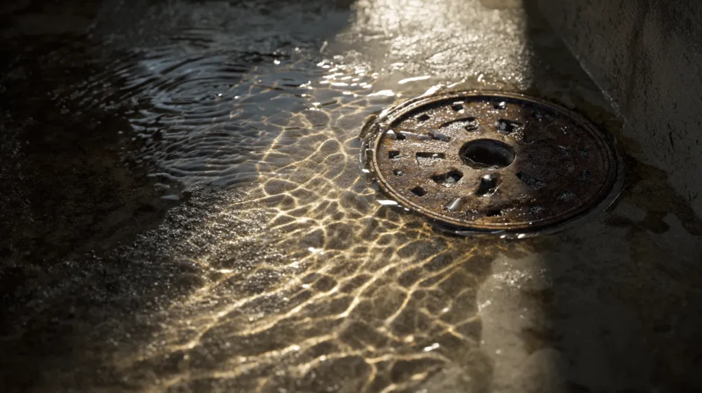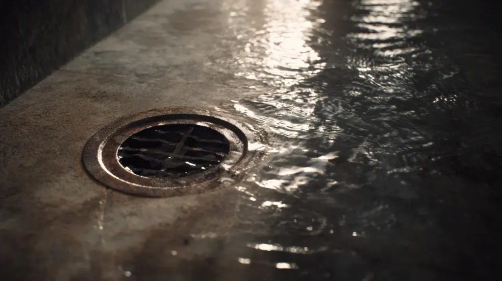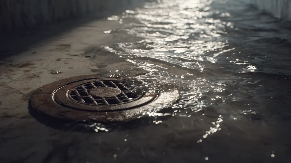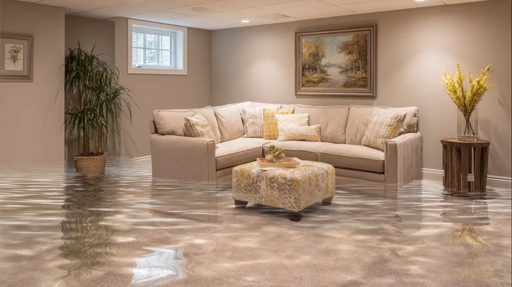 Stormwater surge, burst pipe, or blocked floor drain leaves visible pooling across concrete or finished flooring.